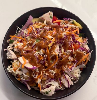1. In a large bowl combine the shredded cabbage, carrots, bell pepper, red onion, mango, chicken, and cilantro.